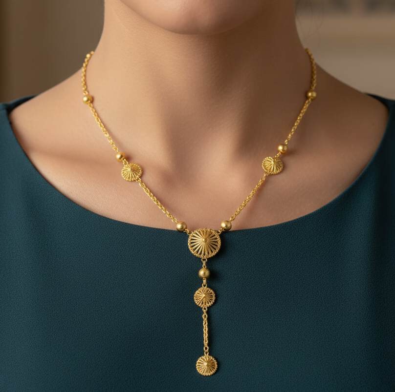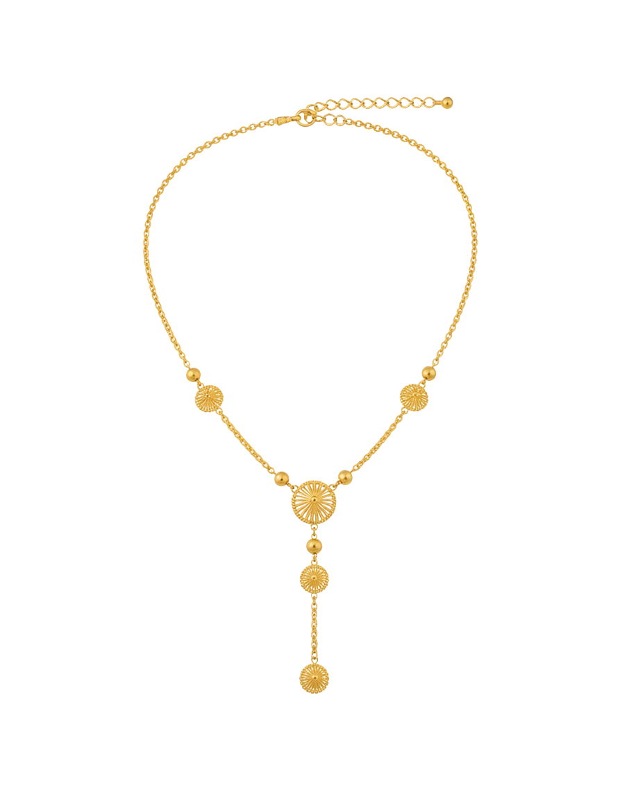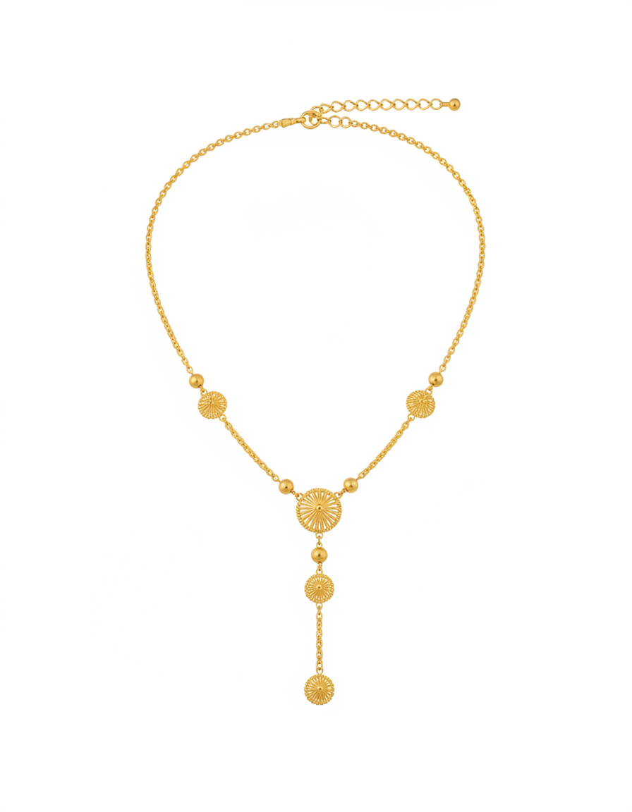 يجسّد هذا العقد جمالاً خالداً يتجاوز صيحات الموضة. تصميمه الدائري الأنيق، المُرصّع بطبقة من الذهب عيار 24 قيراطاً، يُضفي عليه لمسةً عصريةً وكلاسيكيةً. سواءً ارتديته اليوم أو بعد سنوات، سيُضفي لمسةً من الأناقة والسحر على أي إطلالة.